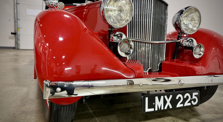 This stunning 1936 Drophead Coupé exemplifies that rare harmony of elegance and performance. Cloaked in rich red coachwork by Coachcraft Ltd. of London, its sweeping wings, long bonnet, and finely balanced proportions evoke the artistry of an era when automobiles were built as much by hand as by imagination. The black leather interior, carefully restored to original specification, complements the exterior’s sophistication with polished wood accents, classic Smiths instrumentation, and meticulous detailing throughout.